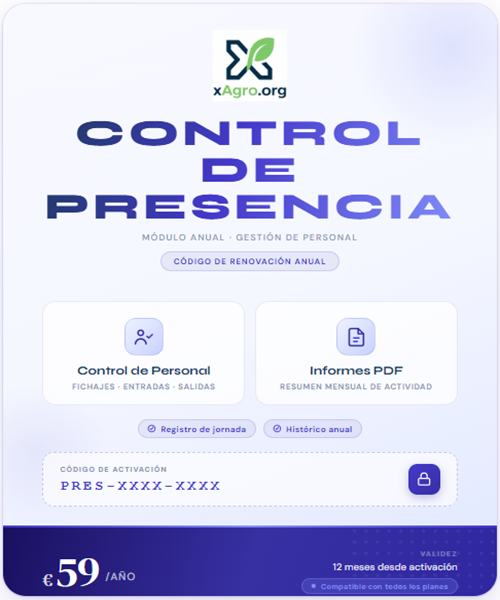 Codigo de activacion anual para el modulo de control de presencia. Fichaje de trabajadores, GPS tracking en tiempo real, timeline y reportes. Compatible con cualquier plan. Incluido en Lux y Vita.