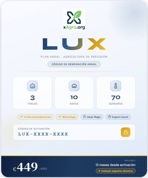 Codigo de renovacion anual para el plan Lux. Hasta 70 sensores, 10 invernaderos y 180 dias de historico. Incluye recomendaciones IA, acceso API, exportacion Excel/CSV y control de presencia.