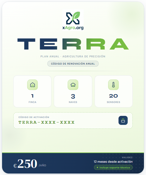 Codigo de renovacion anual para el plan Terra. Hasta 20 sensores, 3 invernaderos y 90 dias de historico.