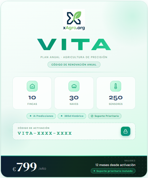 Codigo de renovacion anual para el plan Vita. Hasta 250 sensores, 30 invernaderos y 365 dias de historico. Incluye IA avanzada con predicciones, API + Webhooks, soporte prioritario, control de presencia y fertirriego.