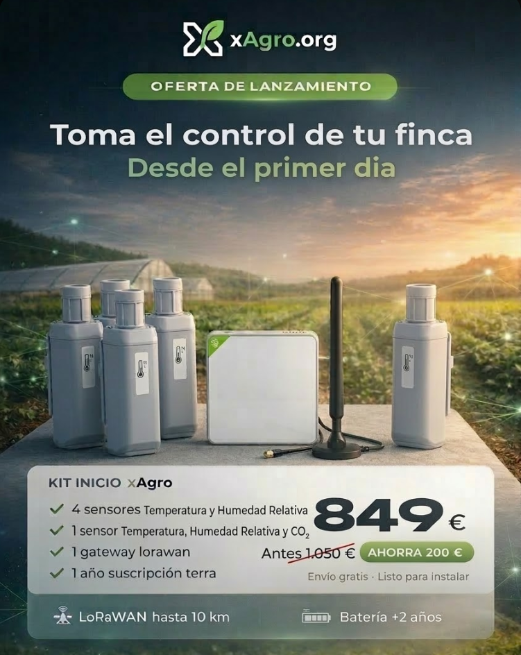 Oferta especial de lanzamiento. Todo lo que necesitas para empezar: • 4x Sensor S2101 (Temperatura + Humedad) • 1x Sensor S2103 (Temperatura + Humedad + CO2) • 1x Gateway LoRaWAN • 1 año de suscripcion Plan Terra (20 sensores, 3 invernaderos, 90 dias historial) Gateway incluido: versión estándar WiFi/Ethernet. Posibilidad de upgrade a 4G (+50€) contactando con soporte. Ahorra 349 EUR respecto a comprar todo por separado (699 + 249 + 250 = 1.198 EUR). Plug & play: solo enciendelos y colocalos.